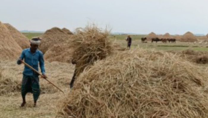 জগন্নাথপুরে গো-খাদ্য খড় তোলায় ব্যাস্ত কৃষক, ঘোলা ভর্তি সোনালী ফসল