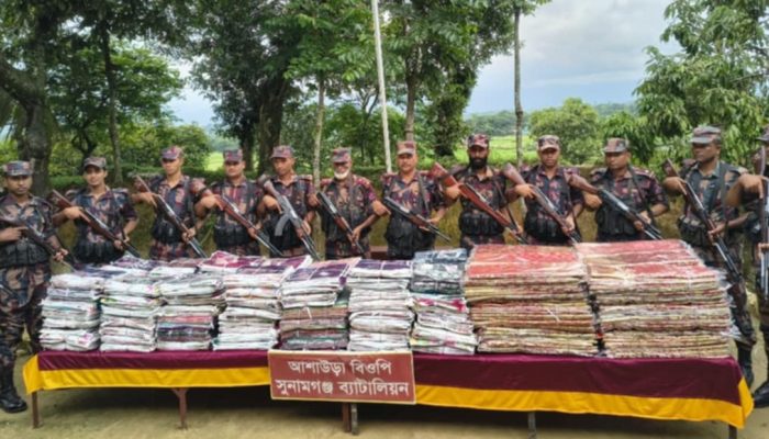 সুনামগঞ্জের রঙ্গারচর ও বোগলা বিজিবি”র পৃথক দুটি অভিযানে ৬৫ লাখ ১২ হাজার টাকার ভারতীয় শাড়ি ও গরু আটক