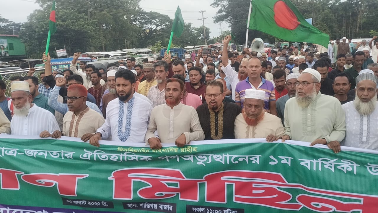 ৩৬ জুলাইয়ের ঐতিহাসিক ছাত্র-জনতার গণঅভ্যুত্থানের প্রথম বর্ষপূর্তি উপলক্ষে শান্তিগঞ্জ উপজেলা জামায়াতে ইসলামী আয়োজিত বর্ণাঢ্য গণমিছিল ও সংক্ষিপ্ত সমাবেশ অনুষ্ঠিত হয়েছে।