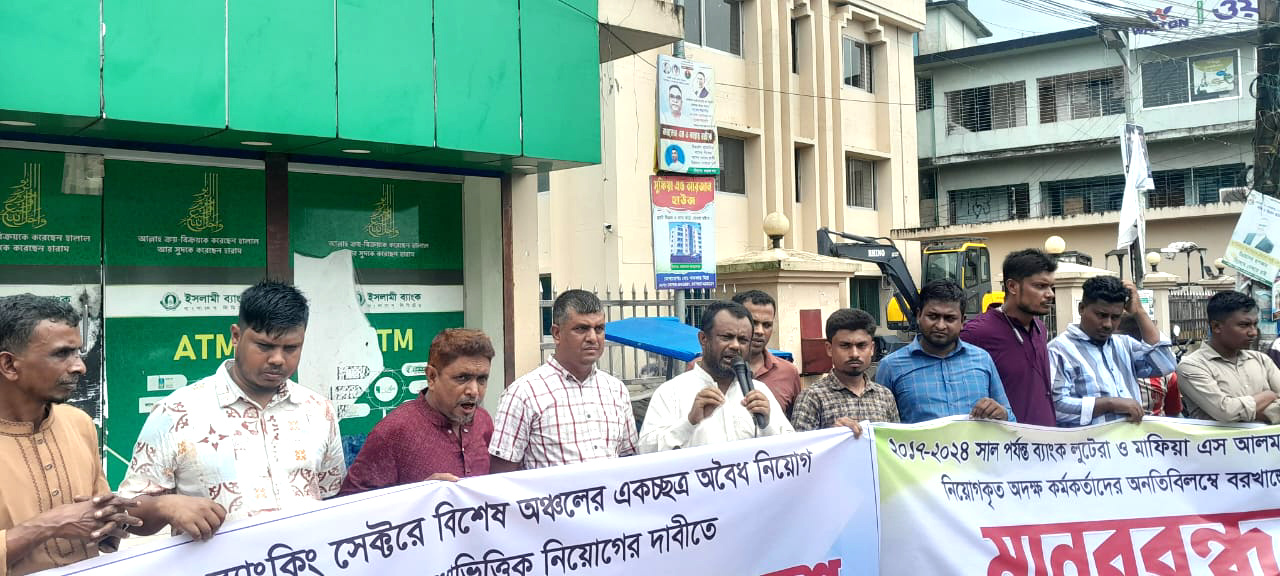 ইসলামি ব্যাংক সহ ব্যাংকিং সেক্টরে অবৈধ নিয়োগ বাতিলের দাবীতে ও মেধাভিত্তিক নিয়োগ এর দাবীতে এবং ব্যাংক লুটেরা ও মাফিয়া এস আলম কর্তৃক অবৈধভাবে নিয়োগকৃত অদক্ষ কর্মকর্তাদের বরখাস্তের দাবীতে জগন্নাথপুরে মানববন্ধন কর্মসূচি অনুষ্ঠিত হয়েছে।সারা দেশের ন্যায় ইসলামী ব্যাংক সহ ব্যাংকিং সেক্টরে বিশেষ অঞ্চলের একচ্ছত্র অবৈধ নিয়োগ বাতিল করে ও অবিলম্বে মেধাভিত্তিক নিয়োগ এর দাবীতে এবং ২০১৭-২০২৪ সাল পর্যন্ত ব্যাংক লুটেরা ও মাফিয়া এস আলম কর্তৃক অবৈধ ভাবে নিয়োগকৃত অদক্ষ কর্মকর্তাদের অনতিবিলম্বে বরখাস্তের দাবীতে ৬ই অক্টোবর রোজ সোমবার সকাল ১০ ঘটিকার সময় সুনামগঞ্জের জগন্নাথপুর পৌর পয়েন্টে বৈষম্য বিরোধী চাকুরী প্রত্যাশী পরিষদ জগন্নাথপুর ও ইসলামি ব্যাংক গ্রাহক ফোরাম জগন্নাথপুর এর আয়োজনে মানববন্ধন কর্মসূচি অনুষ্ঠিত হয়েছে।জগন্নাথপুর বাজার এর বিশিষ্ট ব্যবসায়ী পপুলার ইলেকট্রনিক্স এর পরিচালক মোঃ জামাল উদ্দিন বেলাল এর সভাপতিত্বে ও তরুণ সমাজ সেবক রেজাউল করিম রিপন এর পরিচালনায় অনুষ্ঠিত উক্ত মানববন্ধন কর্মসূচীতে বক্তব্য রাখেন, জগন্নাথপুর পৌর সভার সাবেক কাউন্সিলর মোঃ কামাল হোসেন, রাজনৈতিক ব্যক্তি আ হ ম ওয়ালি উল্লাহ মাহমুদুল হাসান, বৈষম্য বিরোধী ছাত্র নেতা আবু তাহের নাসিম, শিক্ষক মাওলানা জহিরুল ইসলাম, ইসলামর ব্যাংকের গ্রাহক শিবলী সাদিক, লিটন মিয়া ও রাহি কামালী প্রমুখ।বক্তারা তাদের বক্তব্যে বলেন, এস আলম কর্তৃক অবৈধ ভাবে বিশেষ অঞ্চলের একচ্ছত্র ভাবে অদক্ষ কর্মকর্তাদের ইসলামী ব্যাংকে চাকুরী দেওয়ায় ব্যাংকের সেবার মান ধ্বংসের দিকে ধাবিত হচ্ছে। এই অদক্ষ কর্মকর্তাগণ ঠিকমতো সেবা দিতে পারেন না। তাই এ ধরনের কর্মকর্তাদের অবিলম্বে বহিষ্কার করতে হবে। বক্তারা আরো বলেন, ২০১৭ থেকে ২০২৪ সালের আগষ্ট পর্যন্ত বিভিন্ন পদমর্যাদায় এস আলম অবৈধ ভাবে নিয়োগ দিয়েছে। মেধাবী চাকুরী প্রার্থীদের বাদ দিয়ে নিয়োগ করায় ব্যাংকের শৃঙ্খলা চরমভাবে ধ্বংস করা হয়েছে। বক্তারা সকল অবৈধ নিয়োগ বাতিল করে অবিলম্বে মেধার ভিত্তিতে সারা দেশে যোগ্য প্রার্থীদের নিয়োগ দেয়ার আহ্বান জানান।