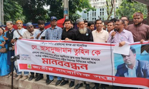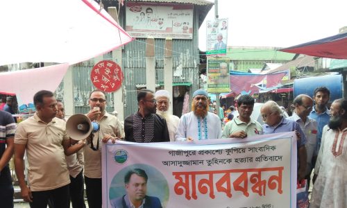 গাজীপুরে সাংবাদিক আসাদুজ্জামান তুহিন হত্যার প্রতিবাদে জাতীয় সাংবাদিক সংস্থার মানববন্ধন