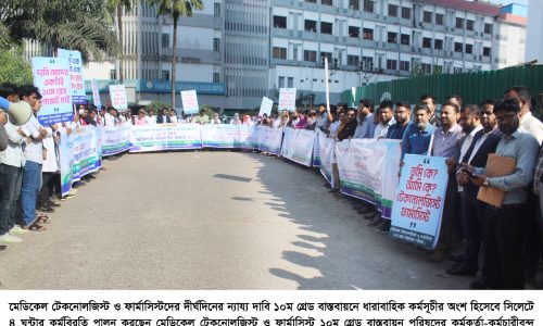 ১০ম গ্রেড বাস্তবায়নের দাবিতে সিলেটে মেডিকেল টেকনোলজিস্ট ও ফার্মাসিস্টদের ৪ ঘন্টার কর্মবিরতি