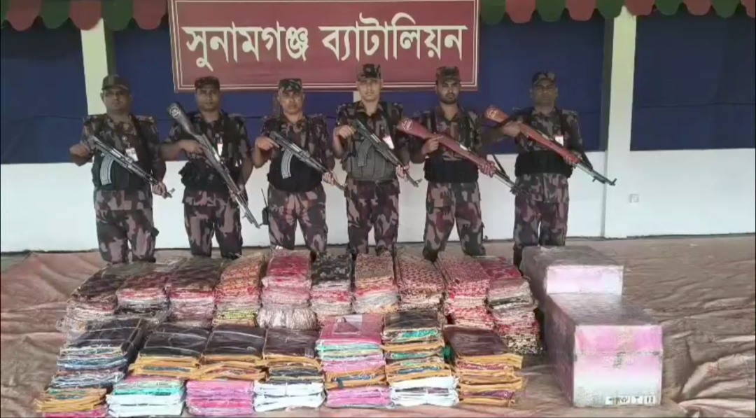 সুনামগঞ্জের হালুয়ারঘাটে সেনাবাহিনী ও বিজিবি”র যৌথ অভিযানে ৫৫ লাখ টাকার উপরে অবৈধ ভারতীয় শাড়ি ও কসমেটিক্র আটক