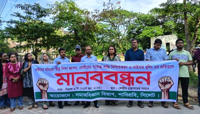 ধর্ষকদের শাস্তি ও সাইবার বুলিংয়ের প্রতিবাদে শাবিতে মানববন্ধন